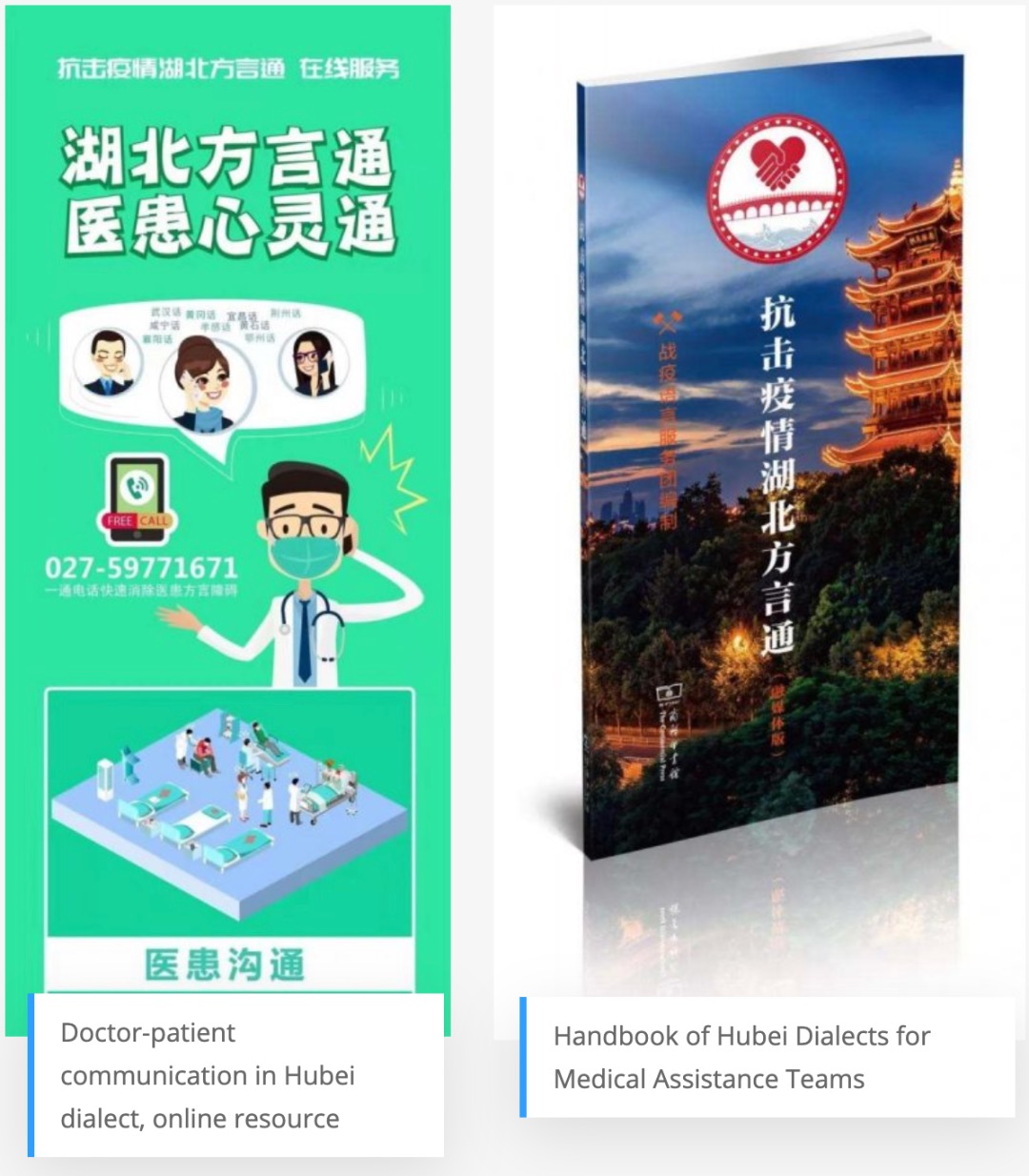 新冠肺炎疫情暴发以来,为帮助外地援鄂医疗队解决医患沟通的方言障碍问题,助力武汉及湖北其他地市抗击新冠肺炎疫情,在教育部、国家语委的指导下,北京语言大学、武汉大学、华中师范大学、清华大学等高校和相关单位的专家学者组成“战疫语言服务团”,研制了《抗击疫情湖北方言通》,为抗击疫情的医护人员及相关群体提供多维度语言服务。