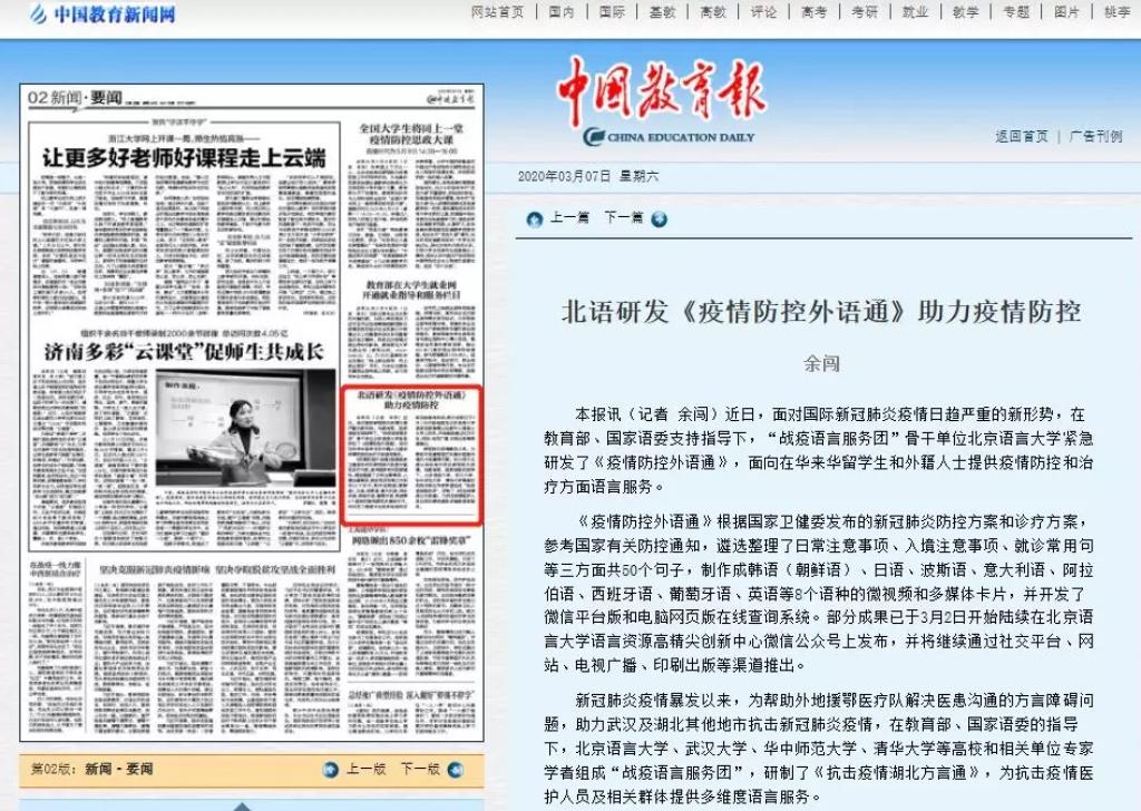 《中国教育报》2020年03月07日刊发《北语研发<疫情防控外语通>助力疫情防控》