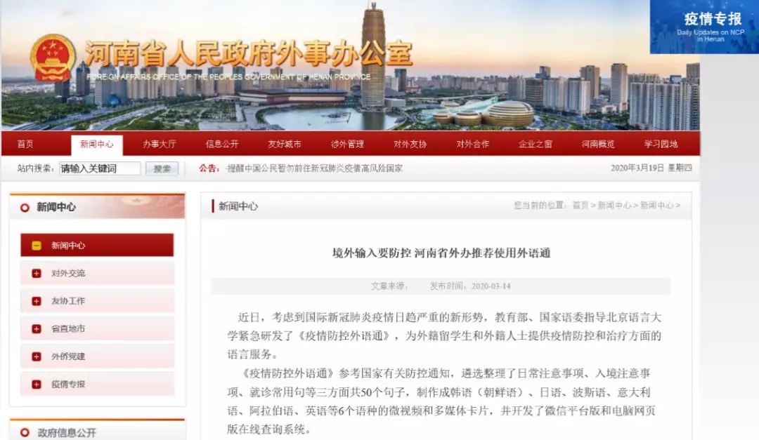 面对国际新冠肺炎疫情日趋严重的新形势,在教育部、国家语委的支持指导下,“战疫语言服务团”骨干单位北京语言大学又紧急研发了《疫情防控外语通》(以下称“《外语通》”),面向在华来华留学生和外籍人士提供疫情防控和治疗方面的语言服务。
