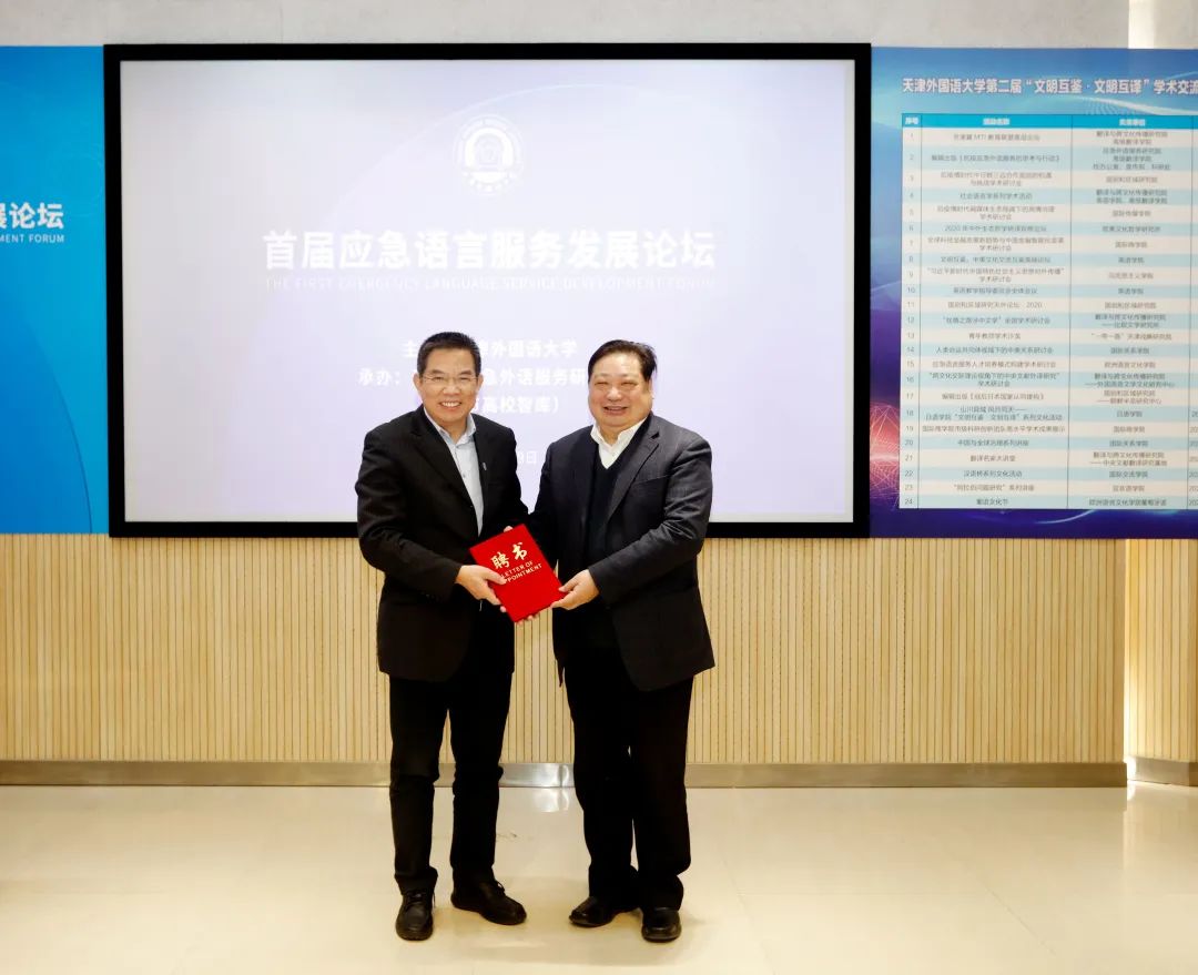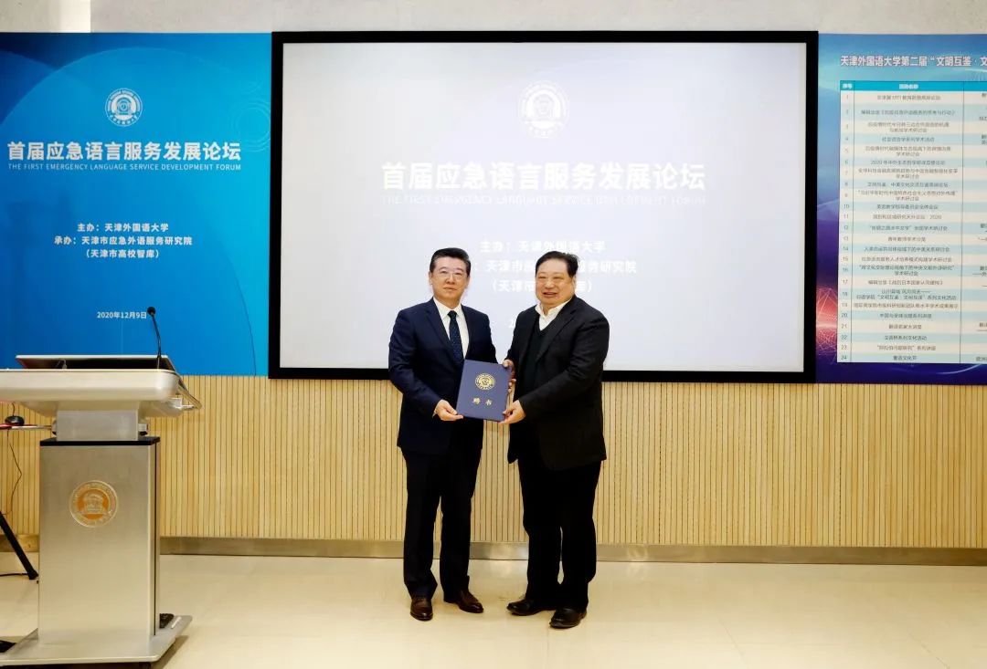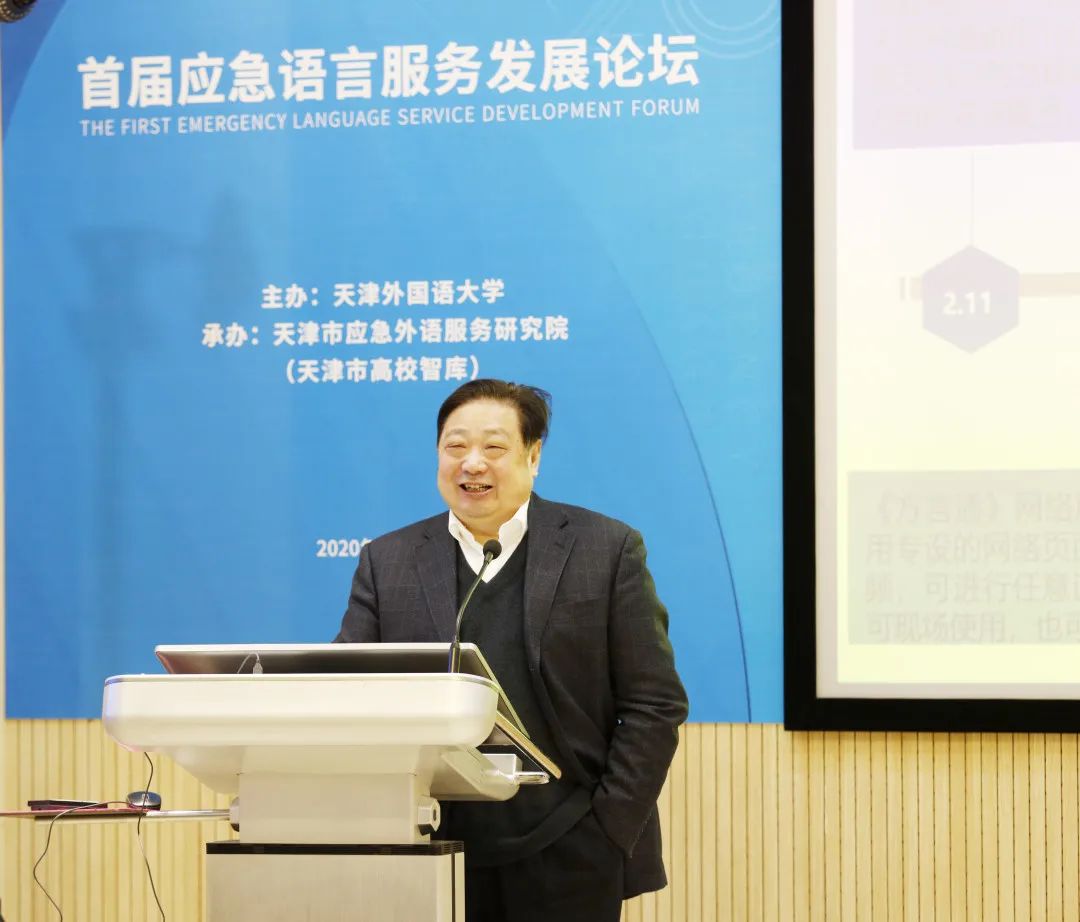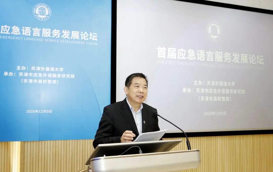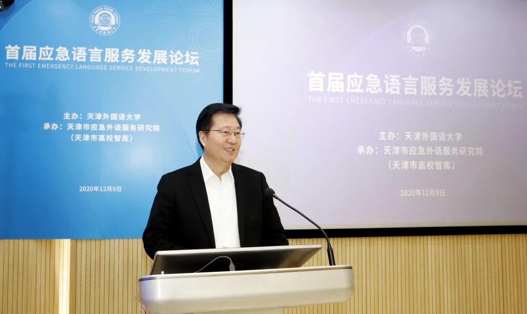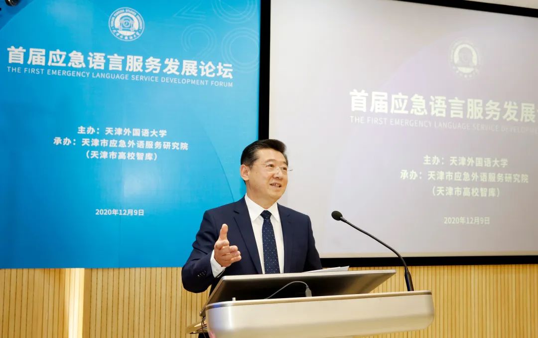为建设集服务国家和地方宏观决策、应急语言服务、协同创新为一体的新型高端智库,推进应急语言服务的学科体系、学术体系、话语体系、实践体系的建设和创新,2020年12月9日,首届应急语言服务发展论坛在天津外国语大学(以下简称“天外”)逸夫楼大江厅举行。论坛由天津外国语大学主办、天津市应急外语服务研究院(以下简称“研究院”)承办。天津市教委副主任白海力,天外校党委书记、研究院院长殷奇出席会议。北京语言大学教授、国家应急语言服务团筹建工作秘书处秘书长李宇明和其他来自天津大学、南开大学、天津师范大学、天津市社会科学界联合会、华为技术有限公司以及天外的多位学者专家参加论坛并作主旨发言。同时,全国各地200余名专家学者同步参加线上会议。