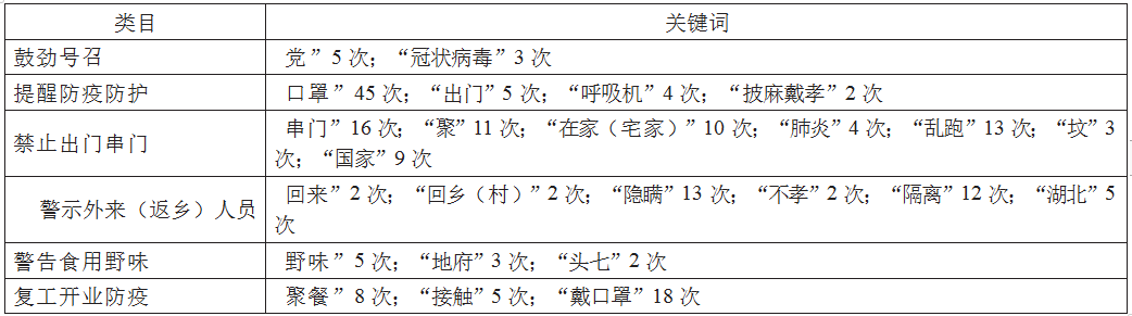 上述分析显示,社区基层团体在宣传相关应急知识时,其应急知识能力随着需要不断发生变化。不同类目标语口号的“高频词”“关键词”有所不同,这种差异保证了宣传的效度和力度。在“鼓劲号召”类中,出现频率最高的词是“党”“全面落实”“疫情防控”等。在“提醒防疫防护”类中,出现频率最高的词是“口罩”,说明戴口罩是此次防控疫情的重点措施;与之相关的关键词一类是“出门”“躺家里”“满街走”等,另一类则与死亡有关,如“呼吸机”“披麻戴孝”等。在“禁止出门串门”类中,出现频率最高的词是“串门”,相关的关键词有“聚会”“聚餐”“乱跑”等,表达相反意义的有“在家”“隔离”等。在“警示外来(返乡)人员”类标语中,高频词有“回来”“回乡”“湖北”等限定“人员”的词语,与之关联的词主要有“隐瞒”“不孝”等。在“警告食用野味”类中,“野味”是主要的高频词,与之相关的是“地府”“头七”等与死亡相关的词。在“复工开业防疫”类中,“聚餐”“接触”和“戴口罩”等是突出的重点。