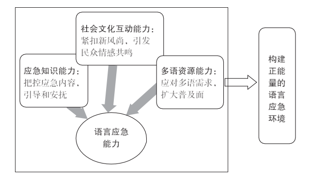 应急知识能力把控应急知识内容,其作用是引导和安抚。网络时代,信息的来源渠道增多,当面临众多选择时,社会民众在如何保持理性思考、如何辨别真伪信息上面临很大挑战。而在突发事件中,由于某些未知的恐惧,非理性思考常会占上风,某些不良言论或谣言等会乘虚而入,极易造成社会群体的集体恐慌,从而不利于防灾减灾工作的顺利开展。社区基层应急知识能力的最大作用就是在第一时间站在事实的基础上,秉承不编造、不夸大、不掩盖的原则,多次、多方位、多角度进行宣传,引导社会民众了解和知晓事实的真相,安抚民众心理,确保突发事件中各项工作的顺利开展。社会文化互动能力的作用是紧扣当代语言文化的新风尚,引发社会民众的情感共鸣,构建平等友爱的人际互动关系。宣传标语口号,其实也是一种交际过程,听话人就是现实语言生活中的社会民众。宣传标语口号中呈现出的语言表达方式、语体风格以及对时代文化特性敏感性的把握,都会在社会民众中得到审视、核查并最终形成反馈。其最终影响是改变长期以来在民众心中形成的“说教”“不接地气”“假大空”等印象,提高民众对宣传内容的社会认同度。多语资源能力的主要作用是有助于满足不同民众多元化的语言服务需求,扩大标语口号或音频宣传的普及面。在多语多言的语言现实中,社区基层社团掌握的语言资源越多,宣传普及到的社会民众越多,宣传服务的质量和效果也会越突出。团体多语能力能快捷有效地将信息传达给每一个社会民众,最大程度地确保每一位民众的信息知情权。以上 3 个要素相互融合,交叉印证,从而构建出一个平等友爱充满正能量的语言应急环境。